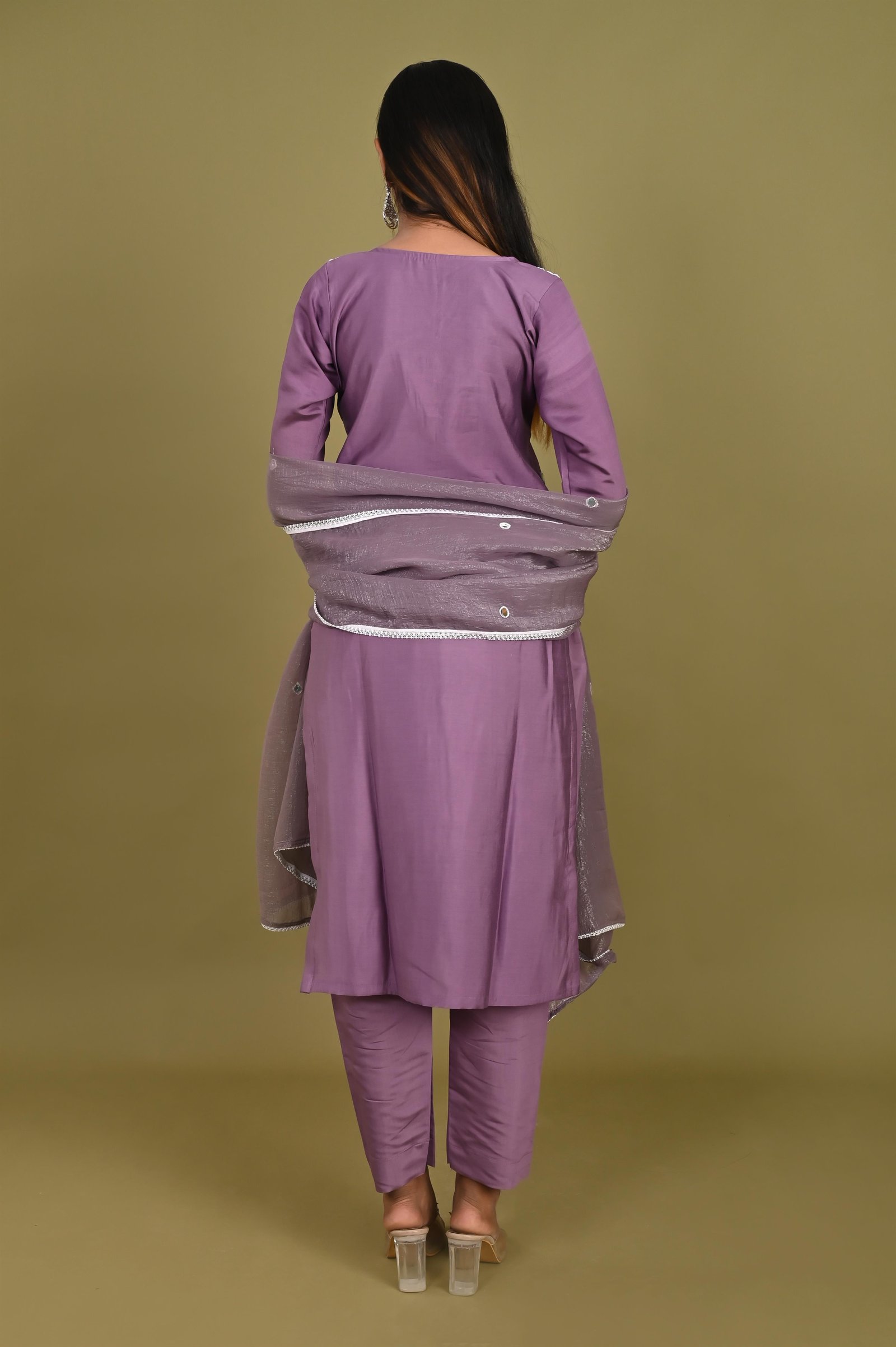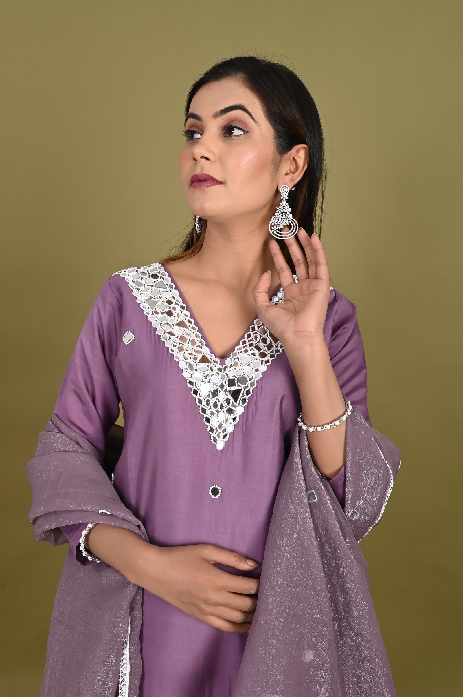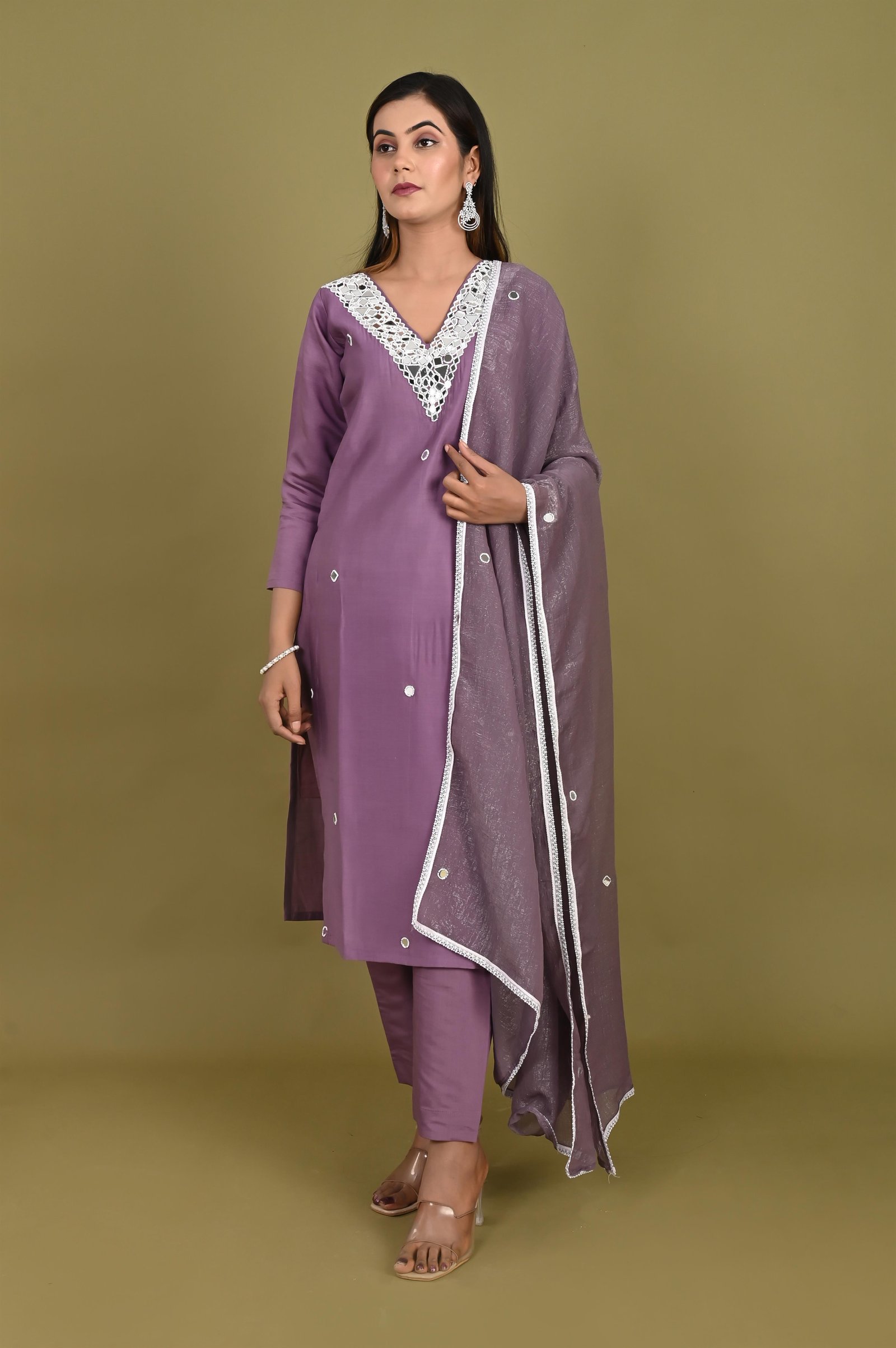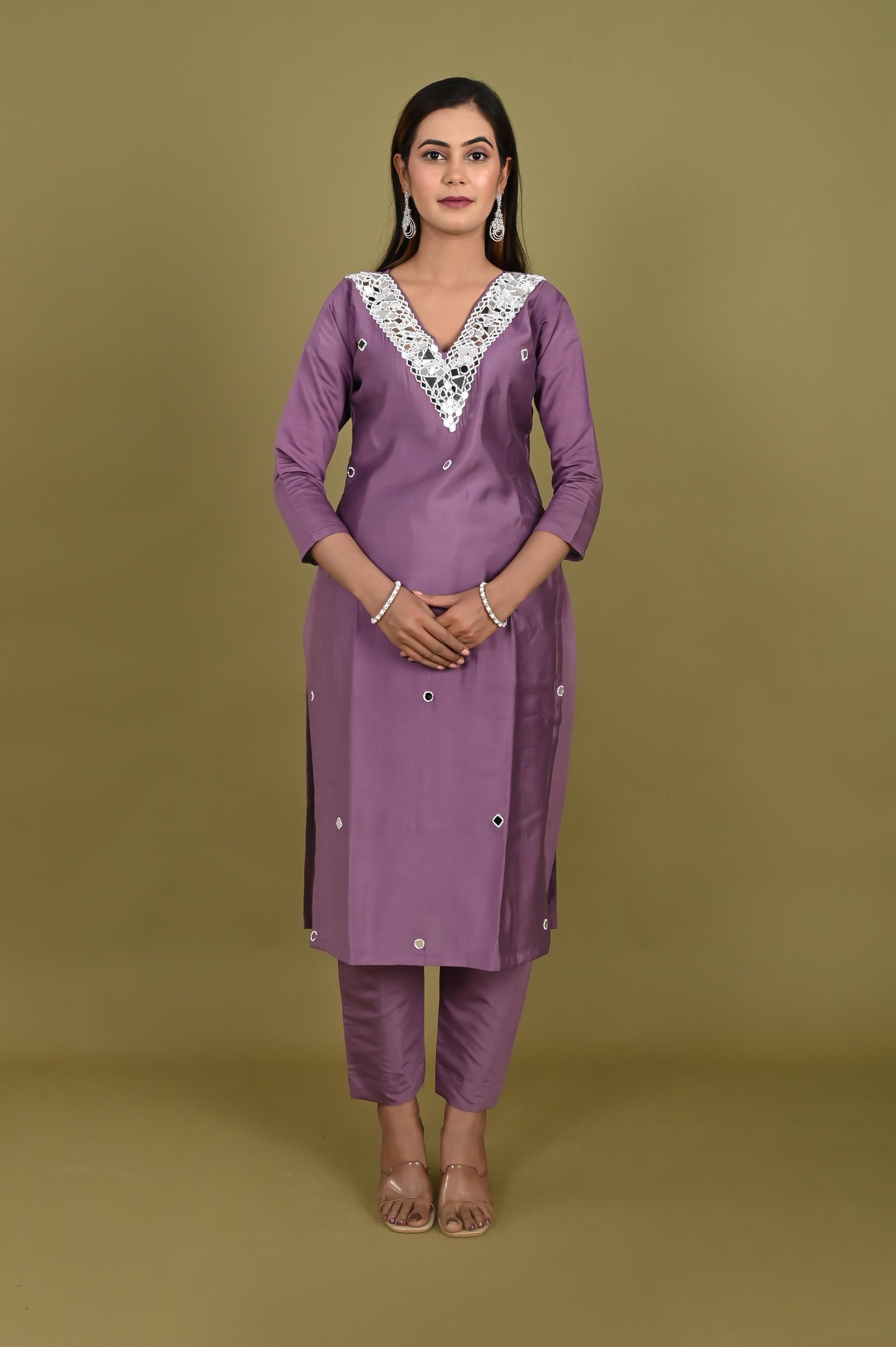 Designed in luxurious royal crepe fabric, this kurta offers a fluid drape and a rich, elegant finish. To enhance comfort, it is carefully layered with a soft cotton lining, making it breathable and easy to wear for extended hours. The highlight of the kurta lies in its hand embroidery embellished with delicate mirror work. The neckline is intricately detailed, while mirror accents are scattered all over the fabric, creating a subtle shimmer with every movement. This exquisite detailing adds a festive charm, making the kurta both traditional and contemporary. ✨ Pant Description ✨ The set is paired with matching pants crafted in royal crepe fabric, also finished with a cotton lining for added comfort. The smooth texture of the fabric complements the kurta, giving the entire ensemble a polished and cohesive look. ✨ Style Note ✨ Perfect for festive gatherings, weddings, and cultural occasions, this ensemble combines lightweight comfort with timeless embellishment. Pair it with statement earrings and embroidered juttis or heels for a complete, elegant look.
