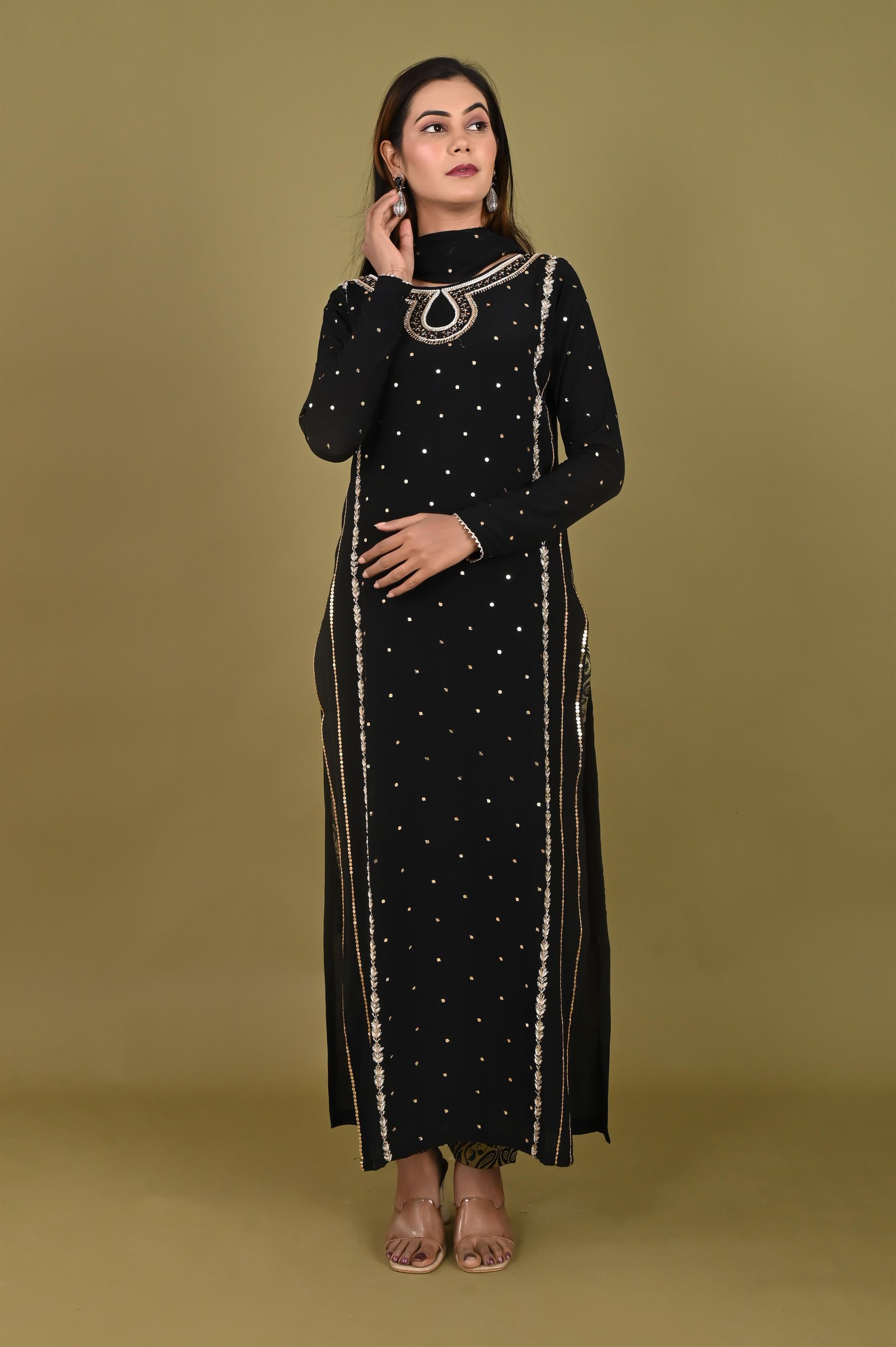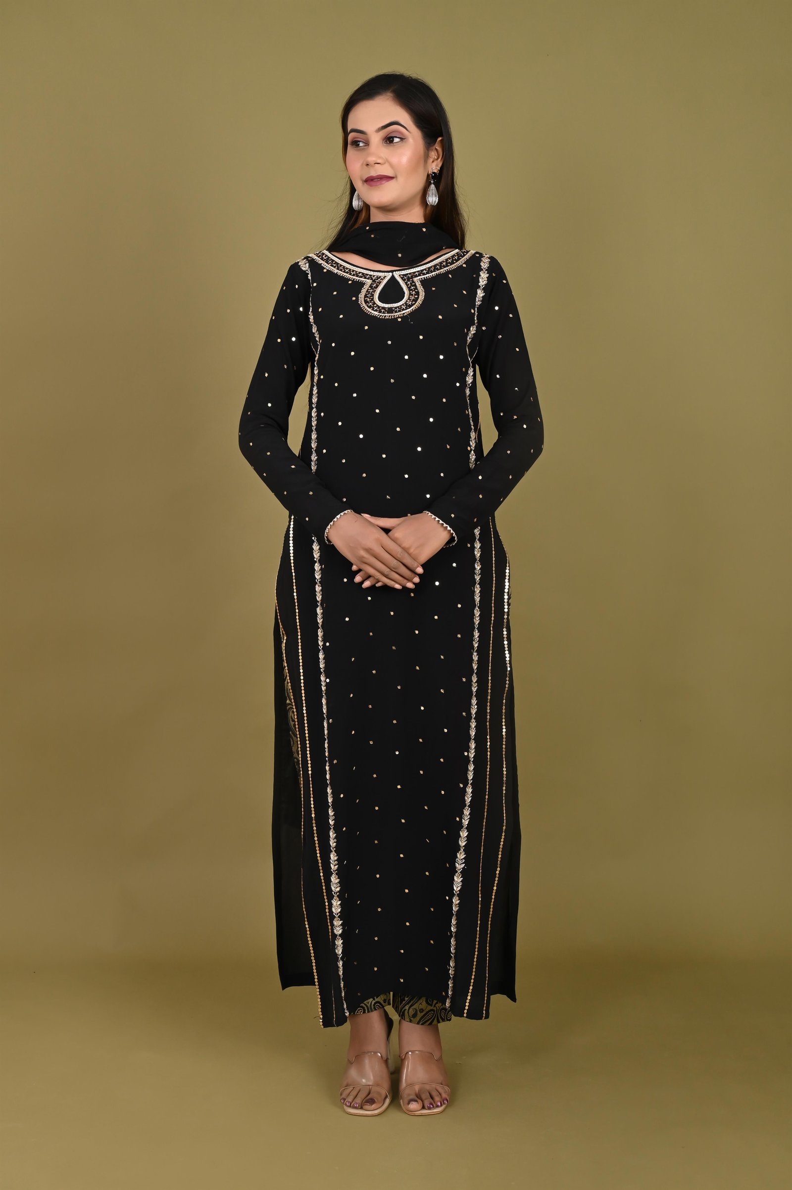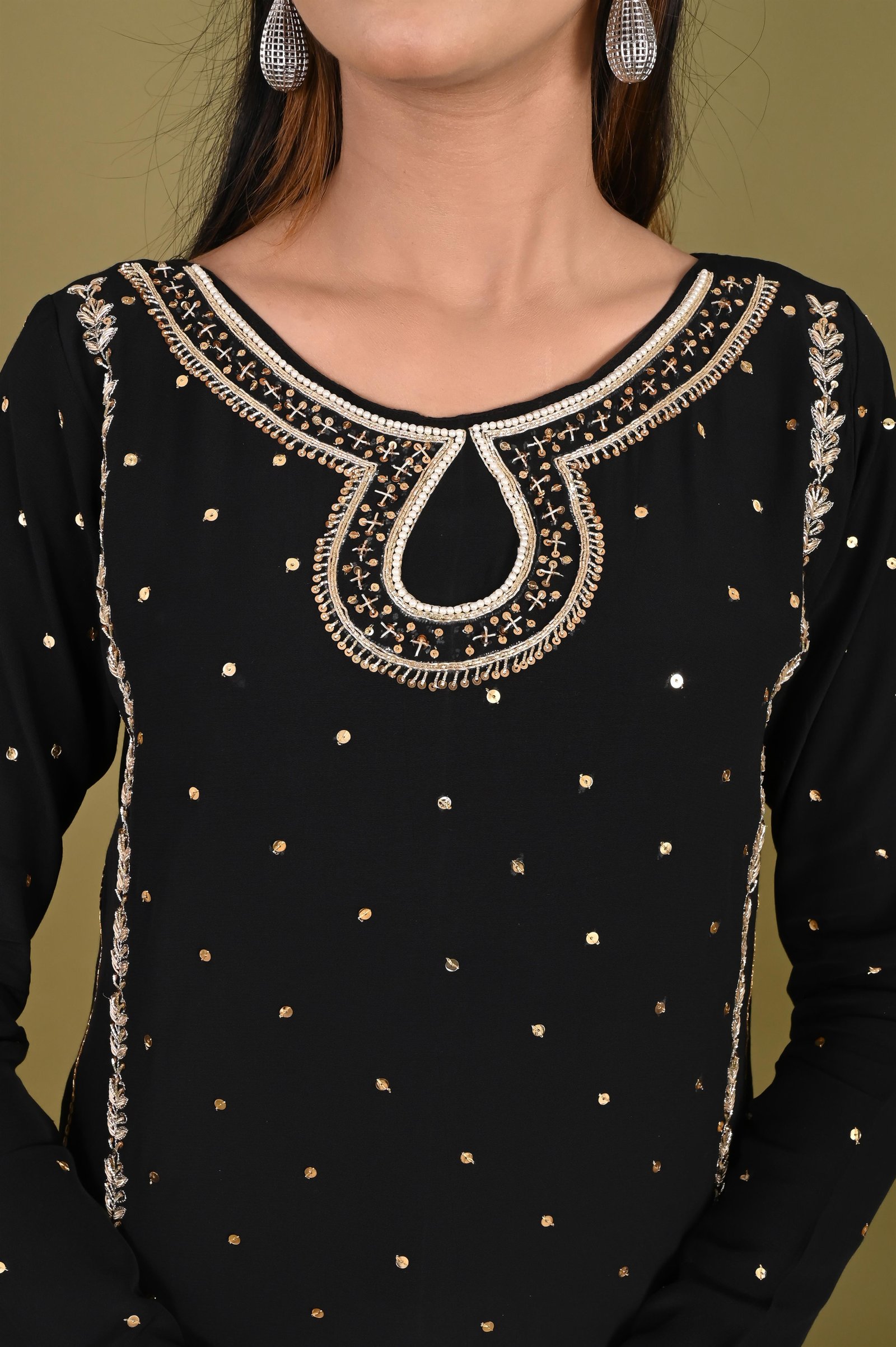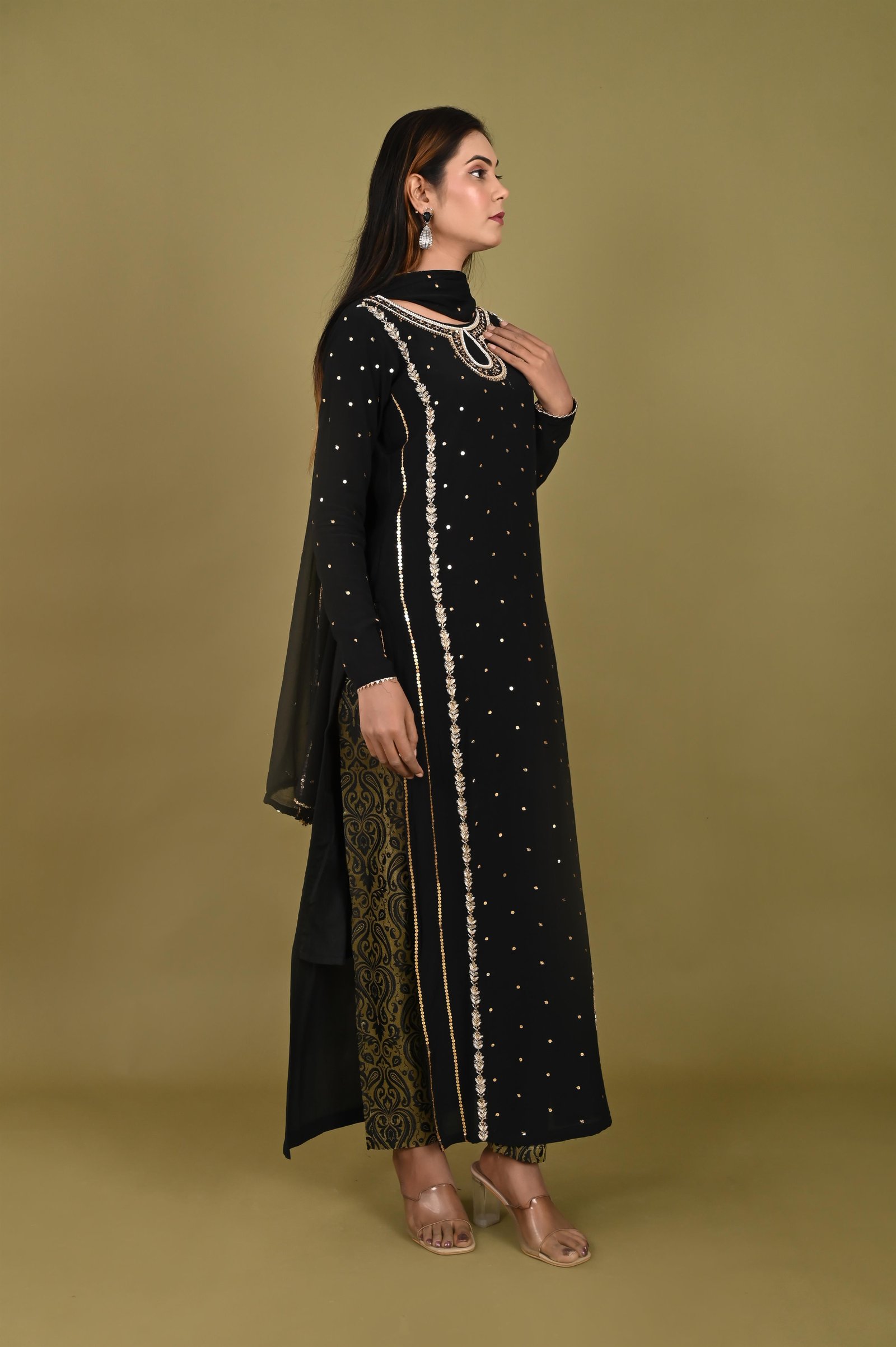 Crafted in premium royal crepe fabric, this kurta exudes sophistication with its smooth drape and graceful finish. To ensure comfort and breathability, it is lined with soft cotton fabric, making it suitable for long wear. The highlight of this piece lies in its hand embroidery, where artisans have intricately adorned the neckline, sleeves, and body with fine zari and zardozi work. The delicate yet elaborate embroidery creates a regal aura, giving the kurta a timeless elegance that reflects traditional craftsmanship. ✨ Pant Description ✨ Complementing the kurta is a pair of pants tailored from rich Banarasi fabric, known for its luxurious weave and subtle sheen. The pants are thoughtfully finished with a cotton lining for comfort, ensuring ease of movement without compromising on style. The Banarasi fabric adds a festive, royal touch, completing the ensemble with perfect harmony. ✨ Style Note ✨ This ensemble is an ideal choice for weddings, festive occasions, and cultural celebrations, offering the perfect blend of traditional artistry and modern sophistication. Pair it with statement jewelry and embellished footwear to complete the regal look.