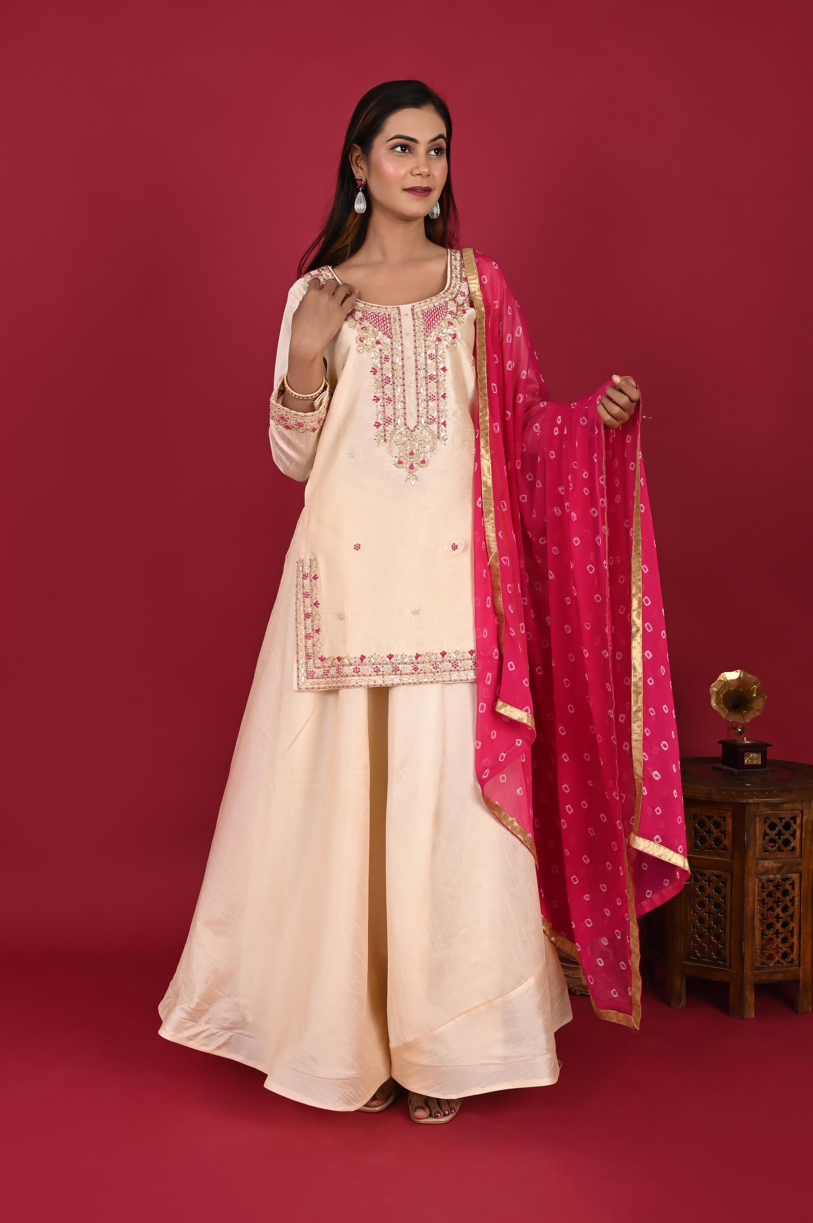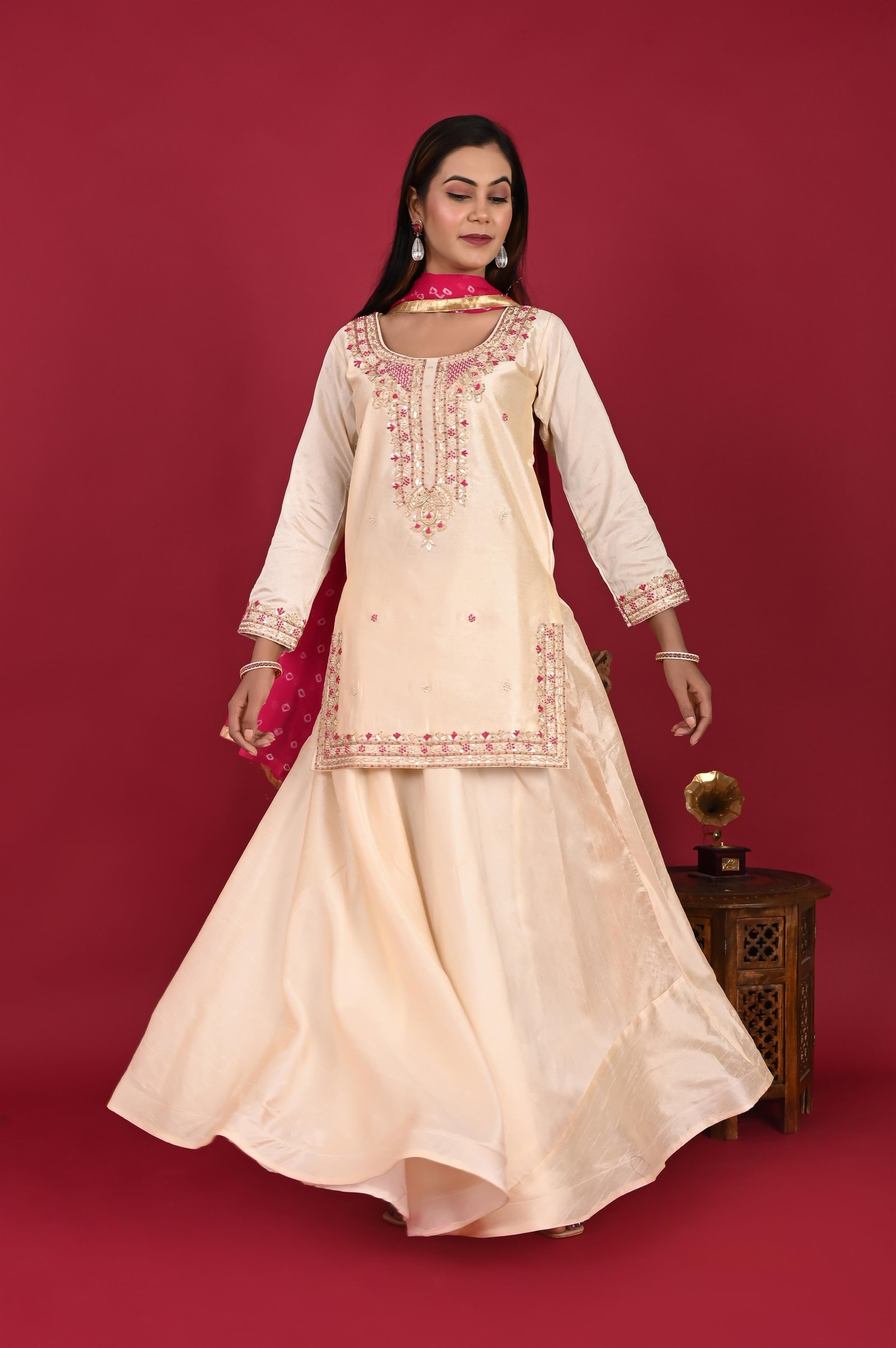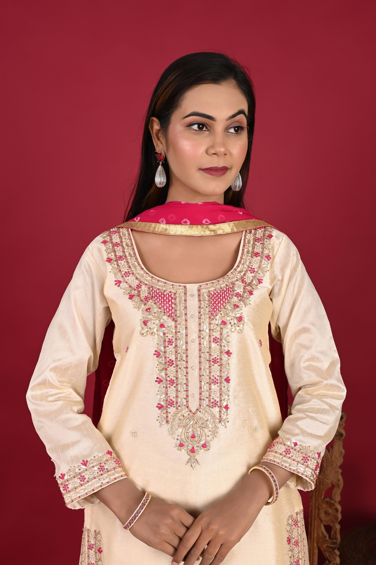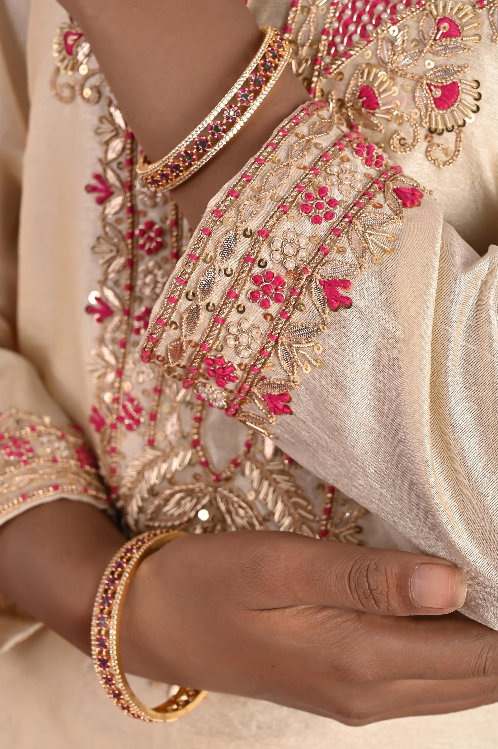 This graceful kurta is made from luxurious Chanderi fabric, known for its lightweight texture, subtle sheen, and airy elegance. To provide comfort without compromising on finesse, it is layered with a soft cotton lining, ensuring ease of wear throughout the day. The design is elevated with intricate hand embroidery, where master artisans have carefully combined zari and zardozi techniques. The embroidery beautifully highlights the neckline and daman (hemline), lending a rich, traditional charm. The sleeves are also delicately embellished, creating a balanced look that reflects fine craftsmanship and timeless artistry. Perfect for festive celebrations, weddings, or formal gatherings, this kurta captures the essence of royal Indian elegance—a seamless blend of tradition, artistry, and comfort.