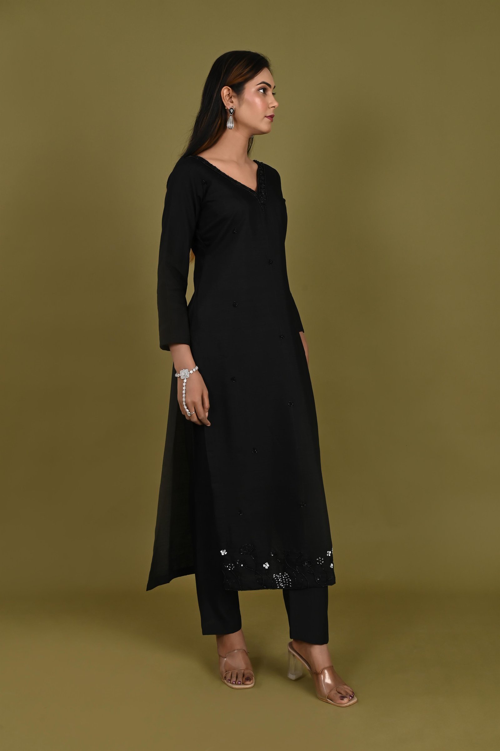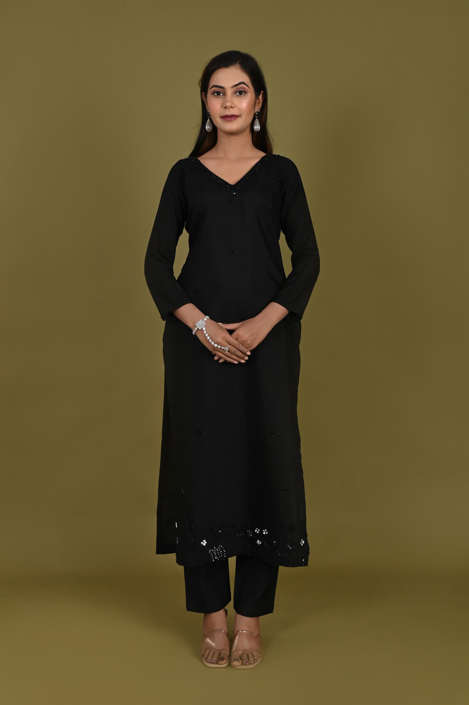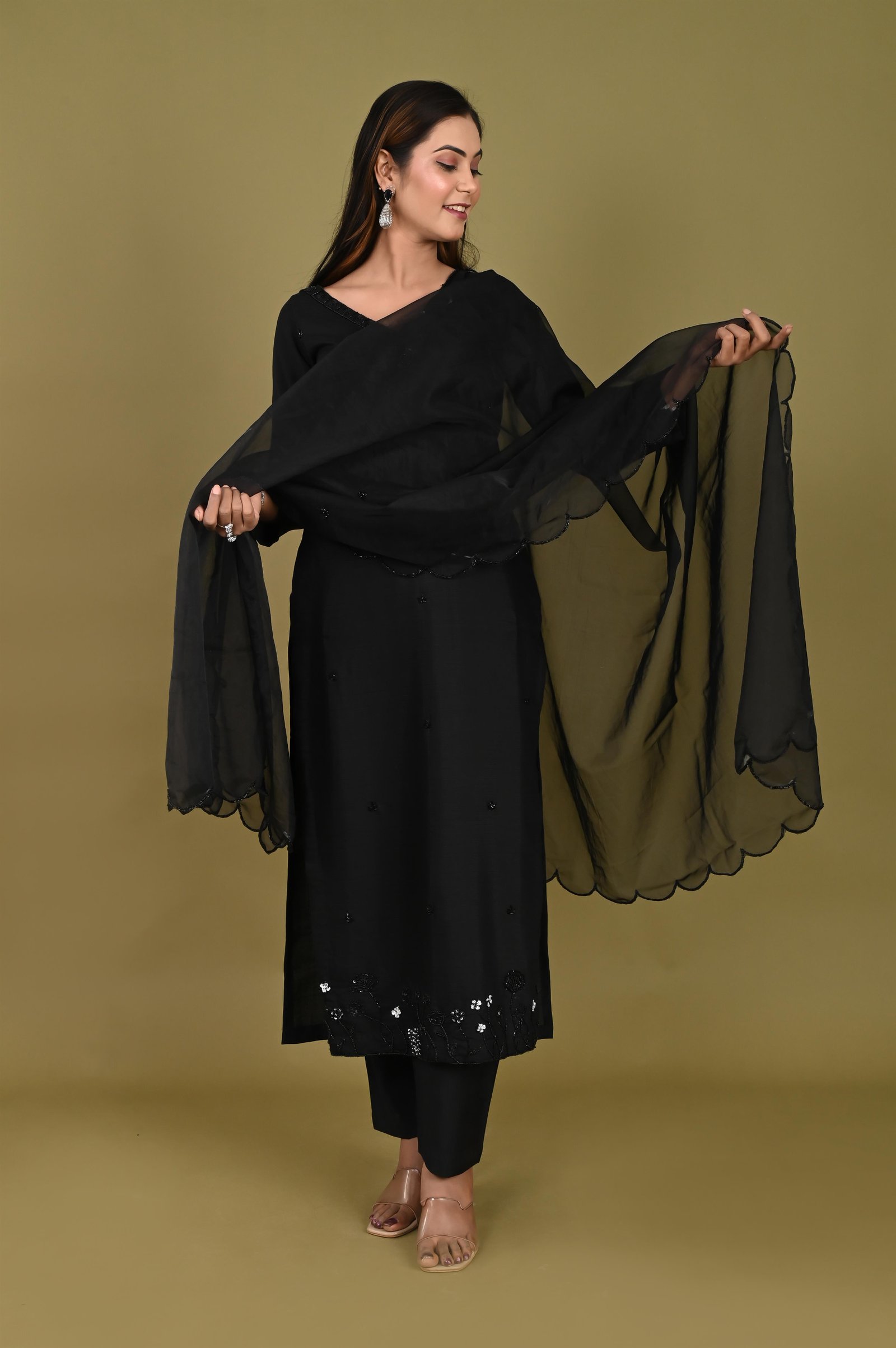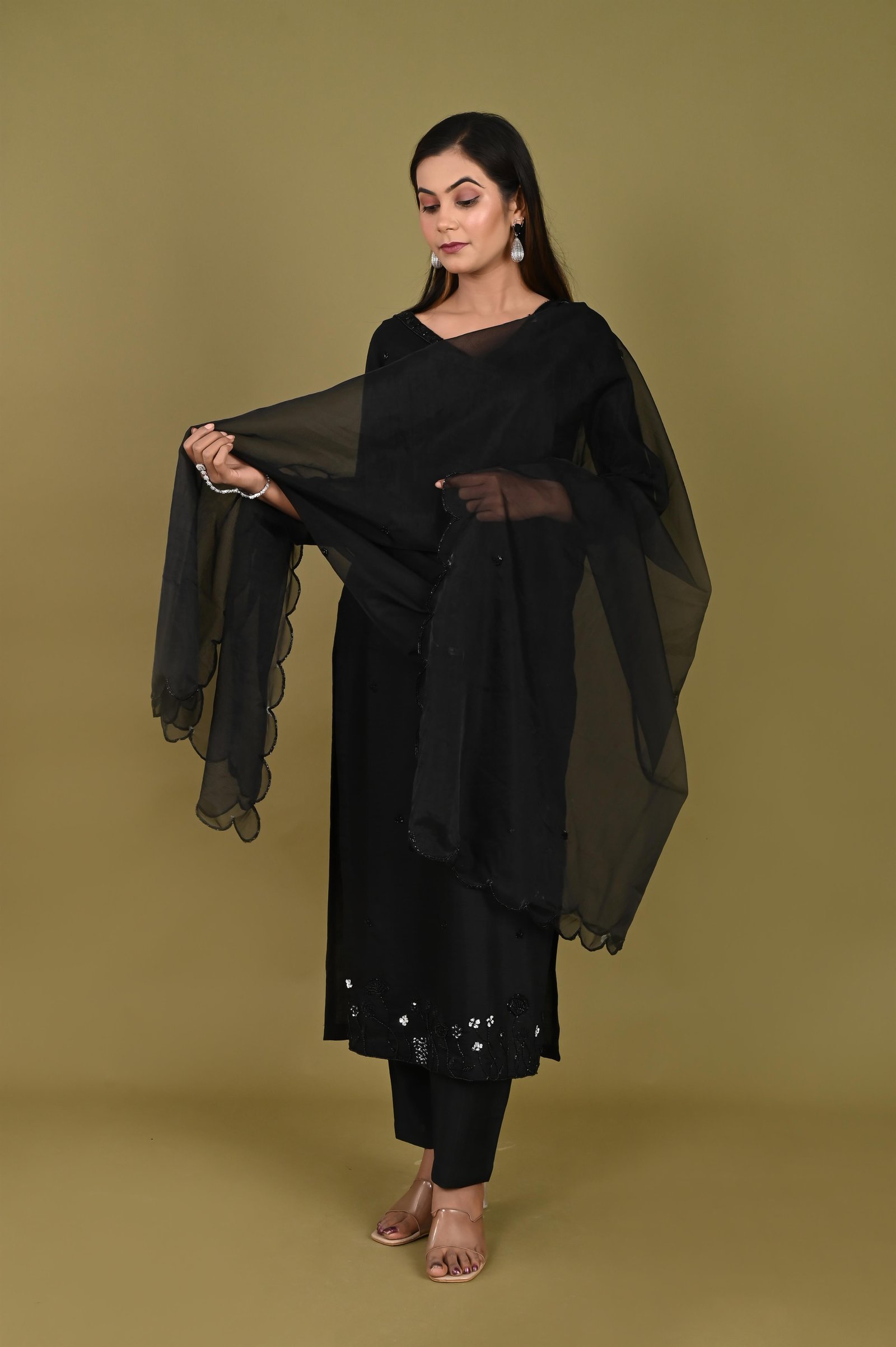 Kurta Description ✨ Tailored in royal crepe fabric, this kurta features a smooth drape and elegant finish. To ensure comfort, it is lined with soft cotton fabric for a breathable and easy fit. The kurta is enhanced with hand embroidery using delicate cutdana work, adding a subtle shimmer and a touch of festive charm. The detailing makes it a perfect balance of traditional craftsmanship and modern elegance. ✨ Pant Description ✨ The set is paired with matching royal crepe pants, also finished with cotton lining for comfort and ease of movement. The minimal yet refined design of the pants complements the richly embroidered kurta beautifully. ✨ Dupatta Description ✨ Completing the look is a 2.5-meter organza dupatta, known for its lightweight and sheer elegance. The dupatta is finished with an all-over broad border, lending it a regal touch that ties the whole ensemble together. ✨ Style Note ✨ This three-piece set is perfect for weddings, festive occasions, and cultural gatherings. Pair it with statement earrings, traditional juttis or heels, and a clutch to create a timelessly elegant look.