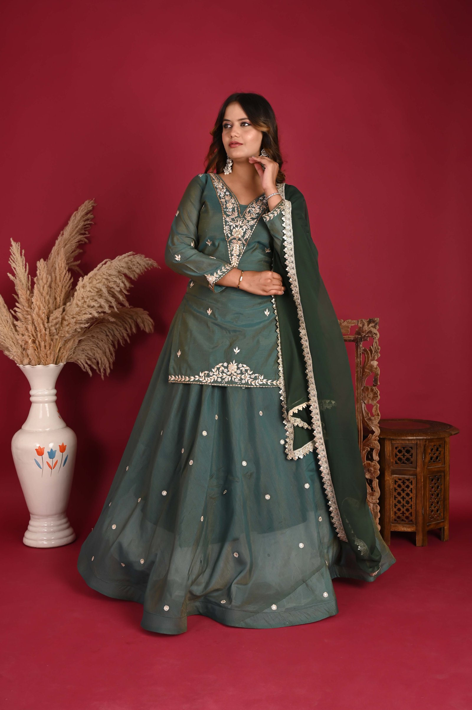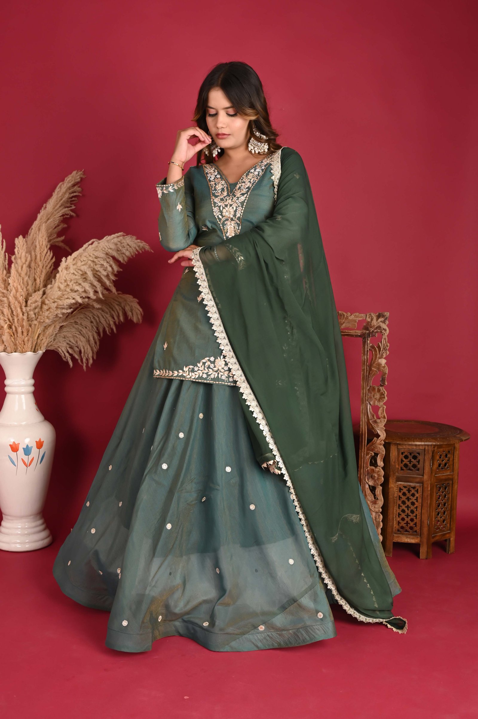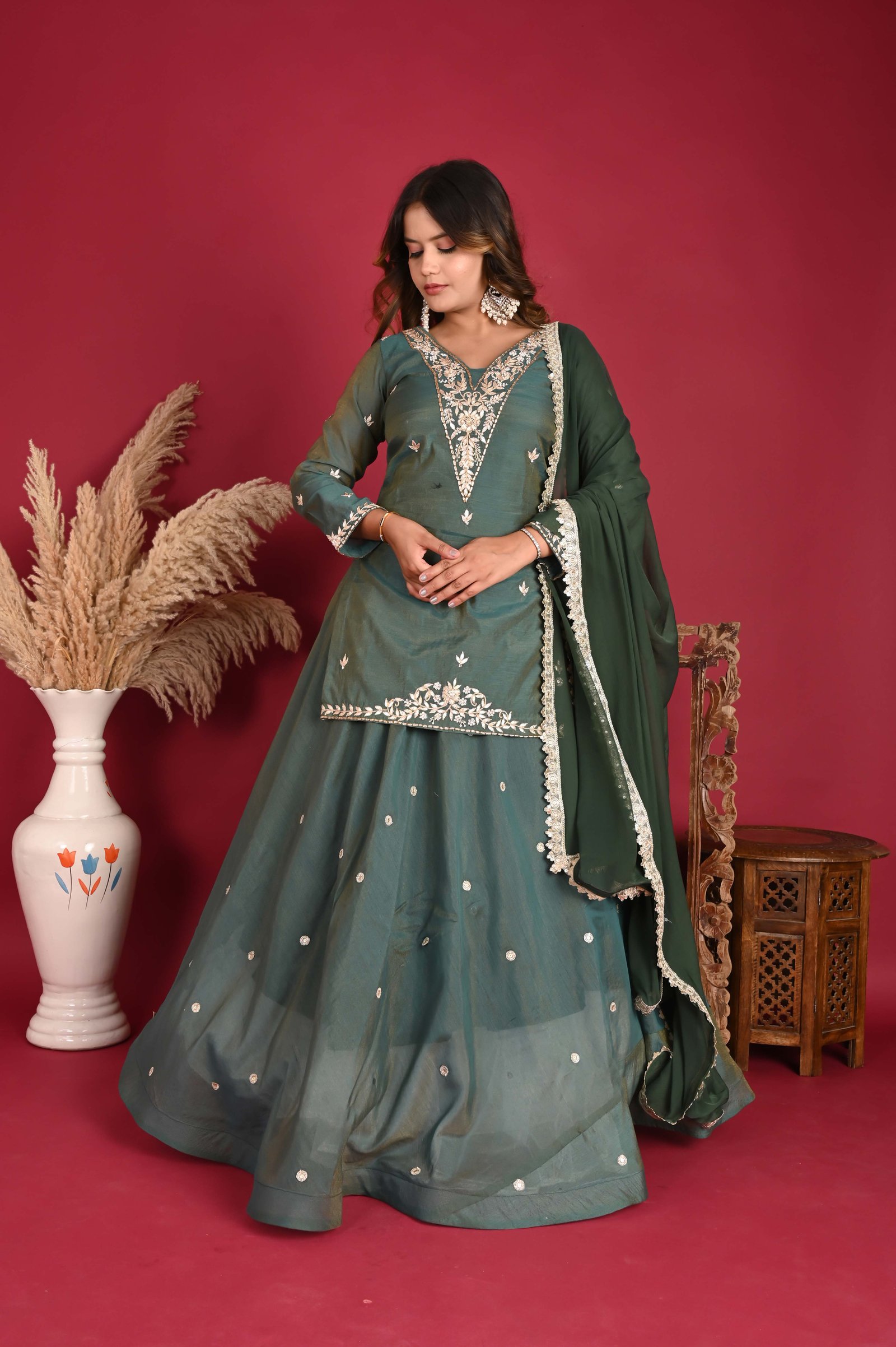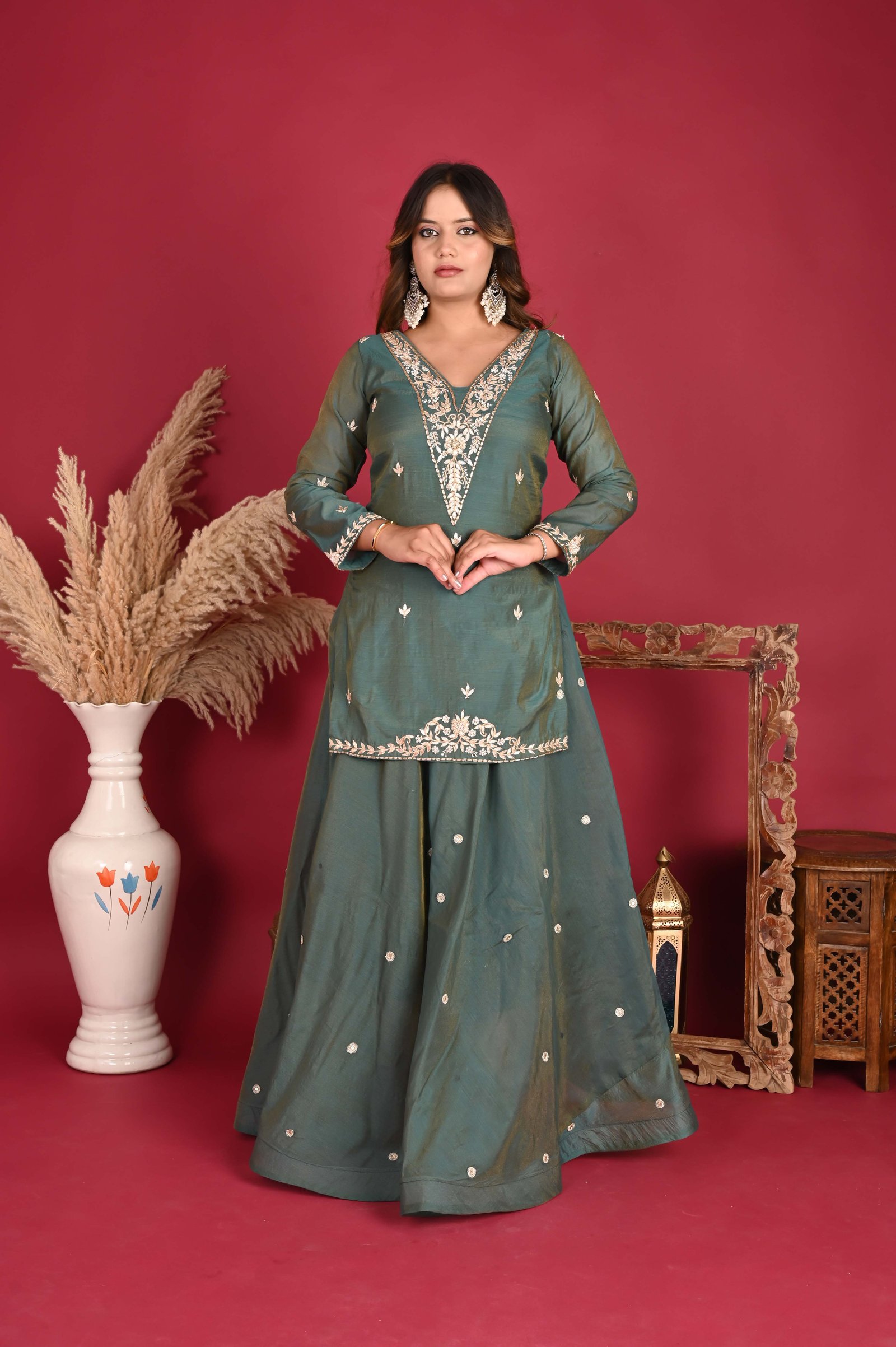 Fabric: Soft, sheer tissue fabric, offering a delicate, almost ethereal quality to the kurta. Lining: Cotton lining inside to ensure comfort and breathability, especially for longer wear. Embroidery: The neckline and sleeve hems are adorned with intricate hand embroidery featuring a mix of zari (gold or silver threads) and zardozi (a type of heavy embroidery using metal threads). The embroidery on the neck is elaborate, creating a beautiful frame around the face with floral or paisley patterns, and the sleeve cuffs have similar embellishments. Length: The kurta is made long, reaching well past the knee or even extending to the mid-calf for a more graceful, floor-length silhouette. This design gives a more traditional, regal appearance. Fit: A slightly tailored fit to maintain the graceful flow of the fabric while giving a refined shape.
