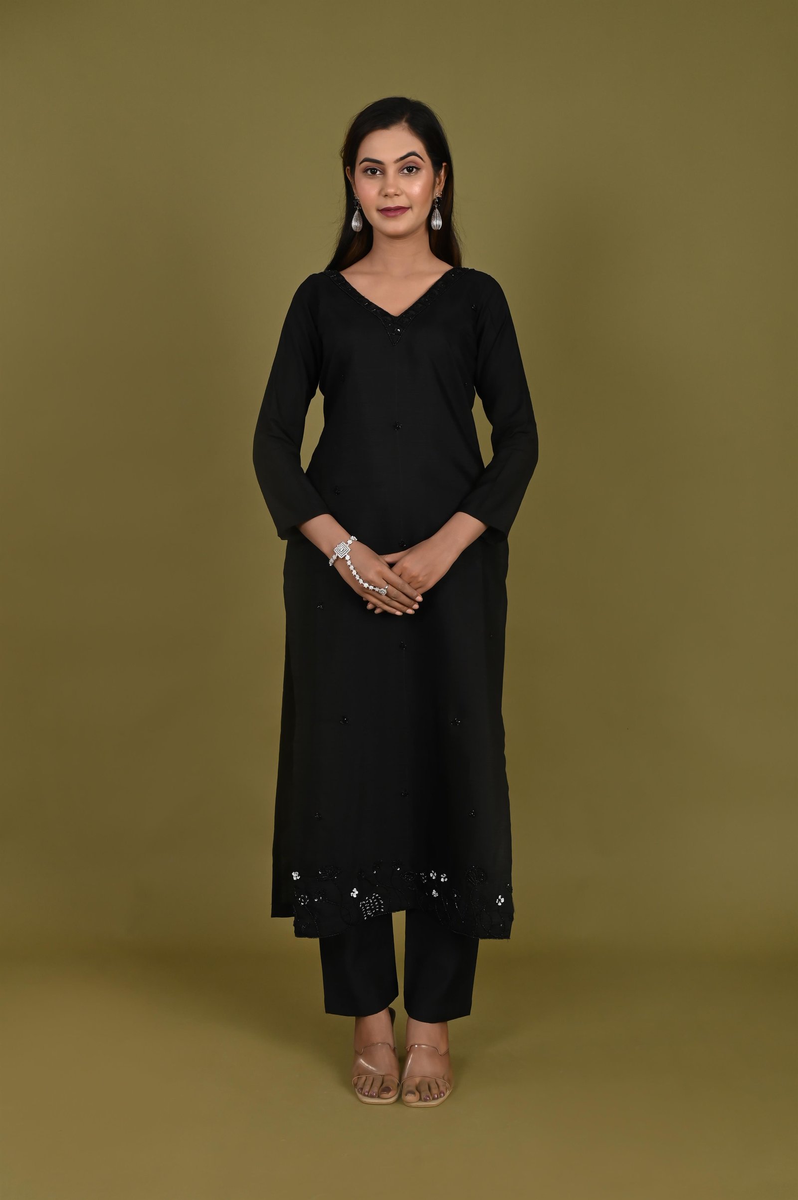 Kurta Description ✨ Tailored in royal crepe fabric, this kurta features a smooth drape and elegant finish. To ensure comfort, it is lined with soft cotton fabric for a breathable and easy fit. The kurta is enhanced with hand embroidery using delicate cutdana work, adding a subtle shimmer and a touch of festive charm. The detailing makes it a perfect balance of traditional craftsmanship and modern elegance. ✨ Pant Description ✨ The set is paired with matching royal crepe pants, also finished with cotton lining for comfort and ease of movement. The minimal yet refined design of the pants complements the richly embroidered kurta beautifully. ✨ Dupatta Description ✨ Completing the look is a 2.5-meter organza dupatta, known for its lightweight and sheer elegance. The dupatta is finished with an all-over broad border, lending it a regal touch that ties the whole ensemble together. ✨ Style Note ✨ This three-piece set is perfect for weddings, festive occasions, and cultural gatherings. Pair it with statement earrings, traditional juttis or heels, and a clutch to create a timelessly elegant look.