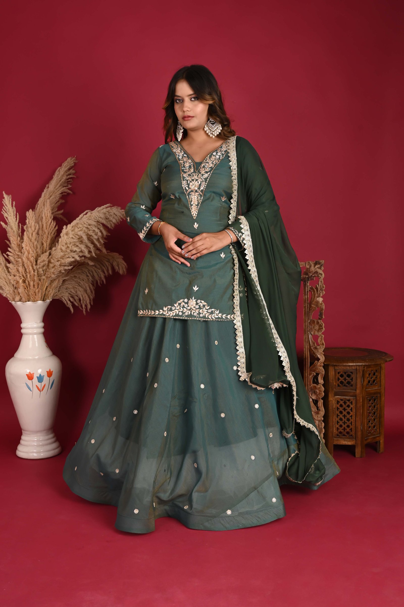 Fabric: Soft, sheer tissue fabric, offering a delicate, almost ethereal quality to the kurta. Lining: Cotton lining inside to ensure comfort and breathability, especially for longer wear. Embroidery: The neckline and sleeve hems are adorned with intricate hand embroidery featuring a mix of zari (gold or silver threads) and zardozi (a type of heavy embroidery using metal threads). The embroidery on the neck is elaborate, creating a beautiful frame around the face with floral or paisley patterns, and the sleeve cuffs have similar embellishments. Length: The kurta is made long, reaching well past the knee or even extending to the mid-calf for a more graceful, floor-length silhouette. This design gives a more traditional, regal appearance. Fit: A slightly tailored fit to maintain the graceful flow of the fabric while giving a refined shape.